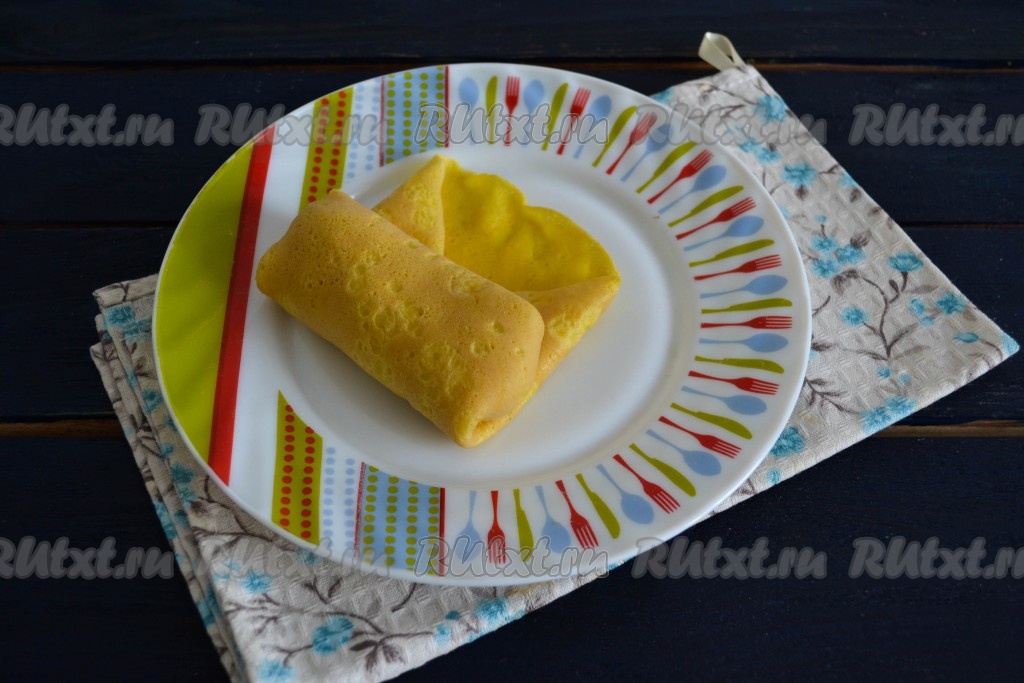 Свернуть яичный блинчик с начинкой конвертиком - для этого нужно вначале завернуть немного края на начинку, а затем свернуть трубочкой.