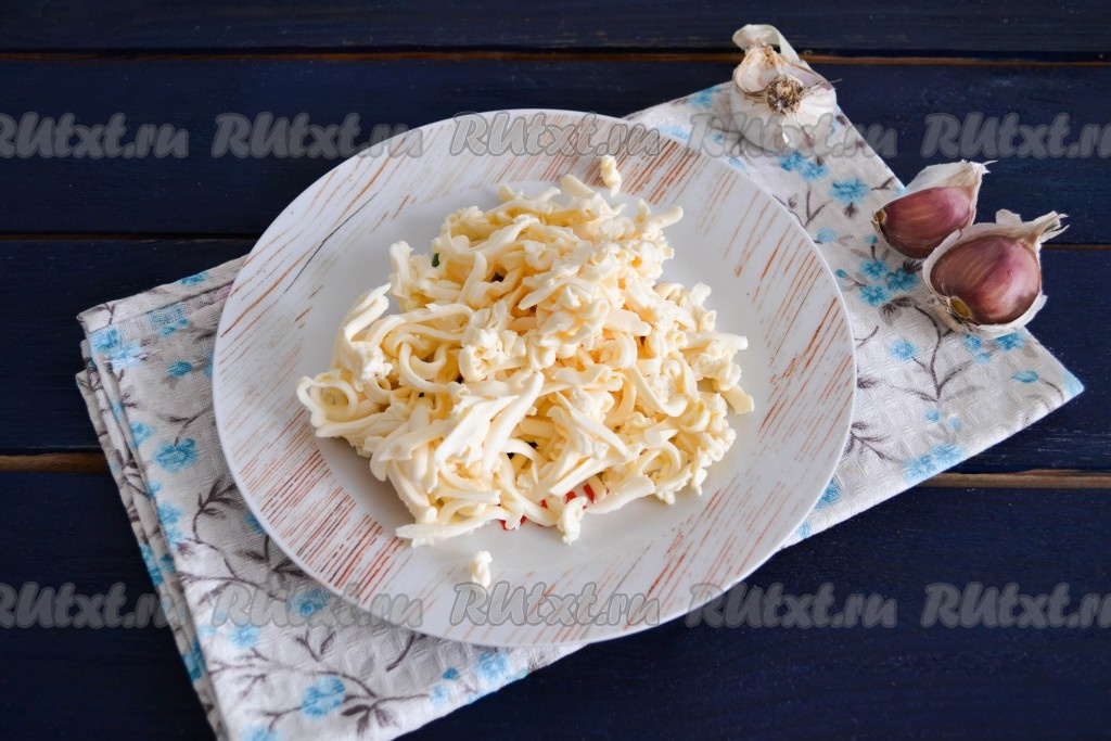 Для приготовления начинки к плавленому сыру, натертому на крупной терке, добавить чеснок, пропущенный через пресс.