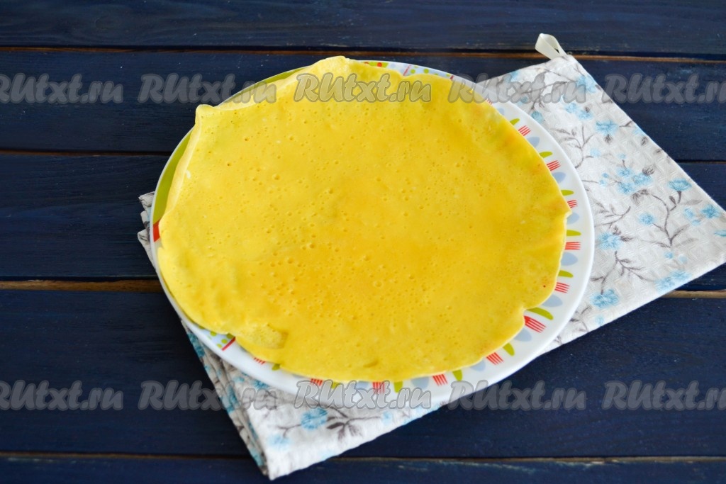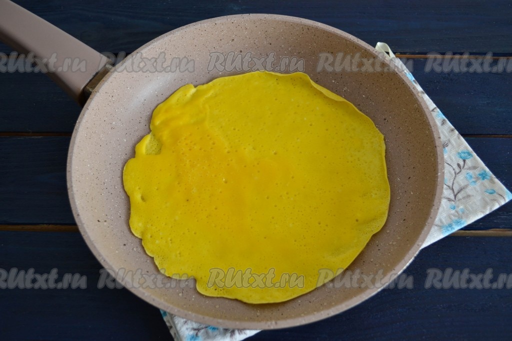 Тщательно размешать, не должно быть комочков. Тесто для яичных блинчиков по консистенции будет, как на обычные блины, - похожим на жидкую сметану.