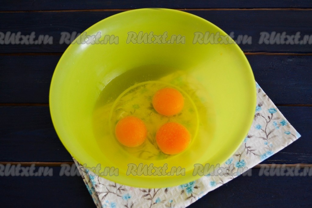 В глубокую миску вбить куриные яйца, влить водичку и всыпать щепотку соли.