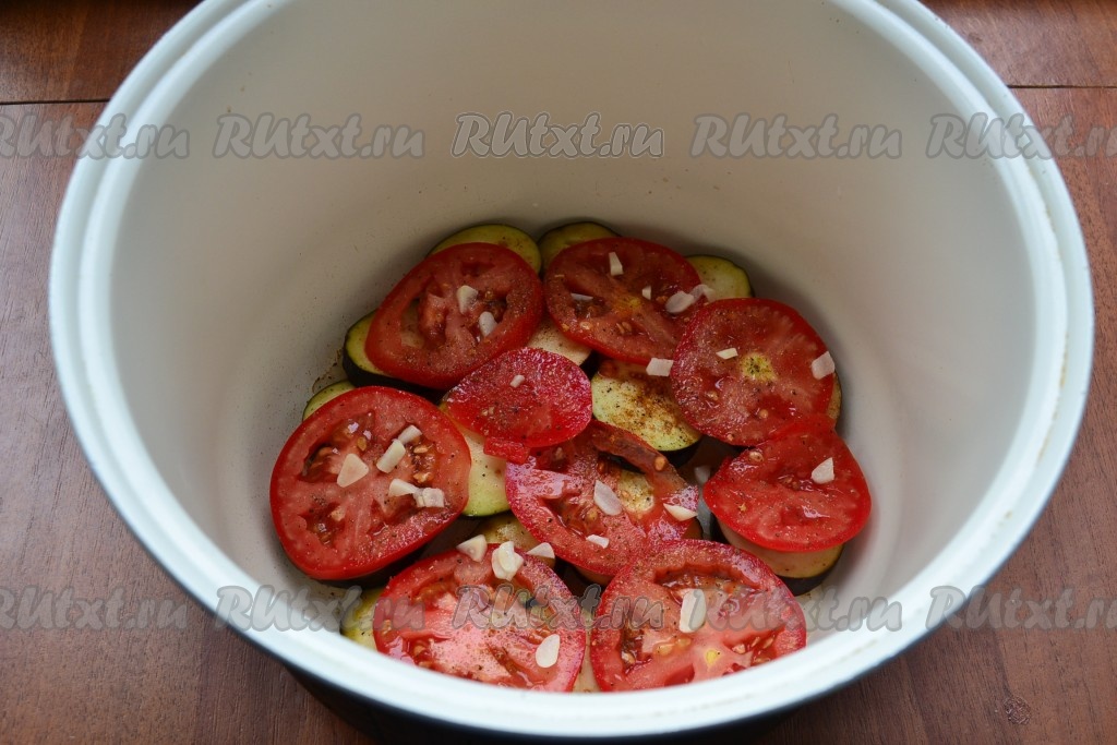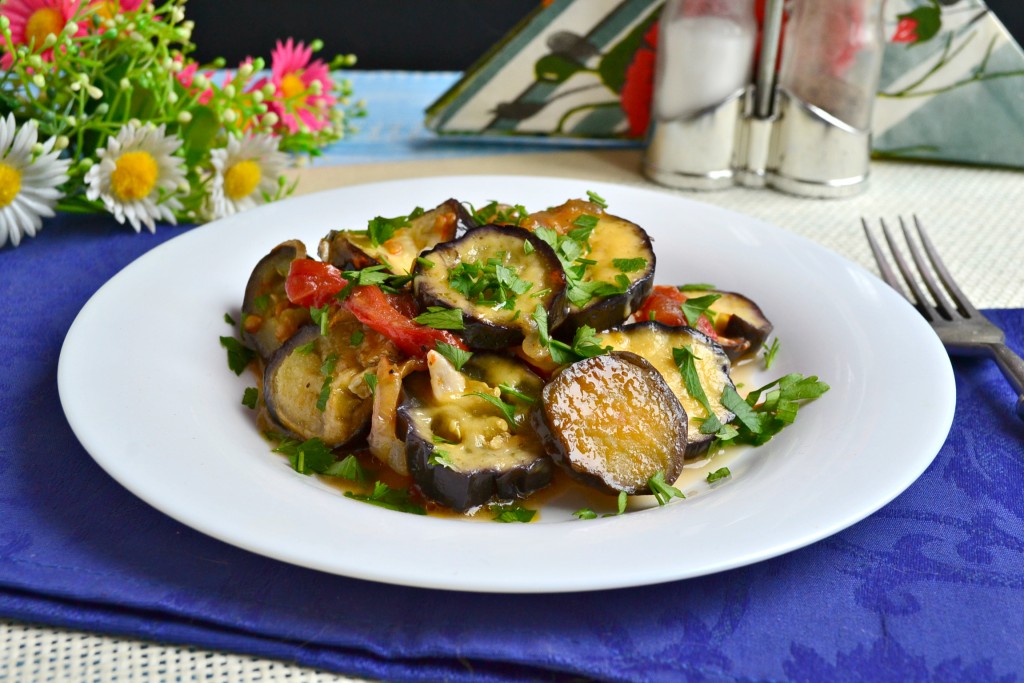 Влить в чашу немного воды и выставить программу "Выпечка" на 25 минут, крышку мультиварки закрыть. Очень вкусные и ароматные баклажаны, приготовленные с помидорами в мультиварке, выложить на тарелку, посыпать зеленью и подать к столу.