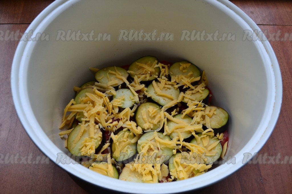 Сверху помидоров выложить оставшиеся баклажаны, которые посыпать натертым на крупной терке сыром.