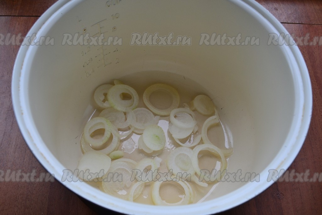 В чашу мультиварки влить растительное масло, выложить очищенный репчатый лук, нарезанный тонкими кольцами или полукольцами.