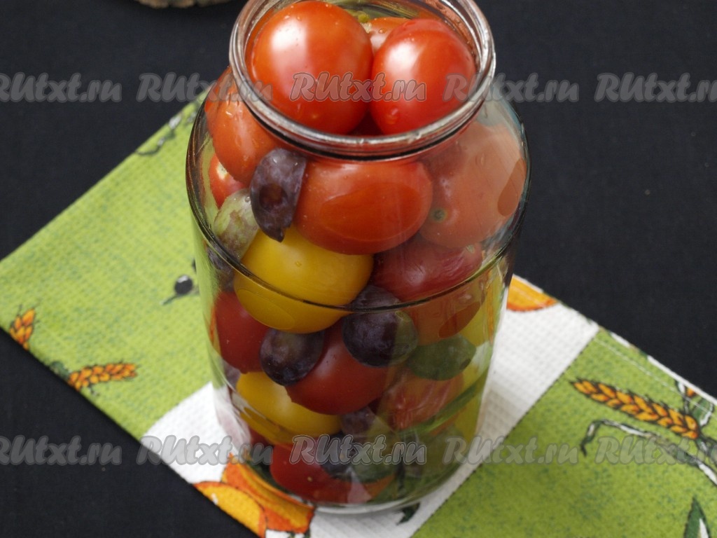 Наполнить банку помидорами и половинками слив в произвольном порядке. Наполняем до горлышка.