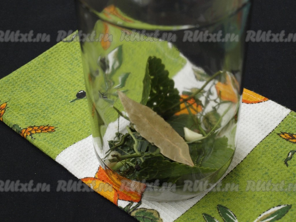 В чистую простерилизованную банку на дно положить зонтик укропа, часть листа хрена, очищенные зубчики чеснока, лавровый лист, чёрный перец горошком и душистый перец.
