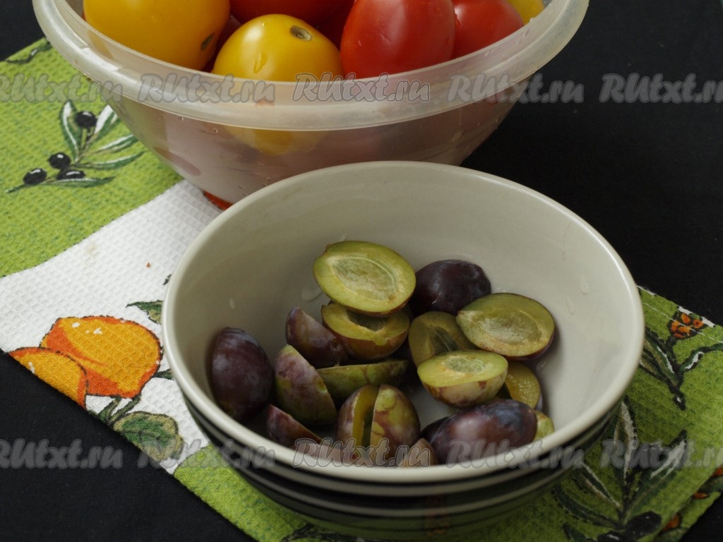 Вымыть помидоры и сливы. Разрезать каждую сливу на 2 половинки и удалить косточку.