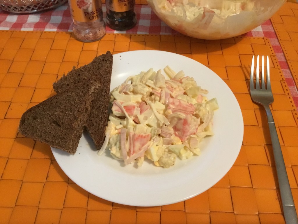 Наш нежный, вкусный салат с маринованными кукурузными початками и крабовыми палочками готов! Можно подавать к столу!