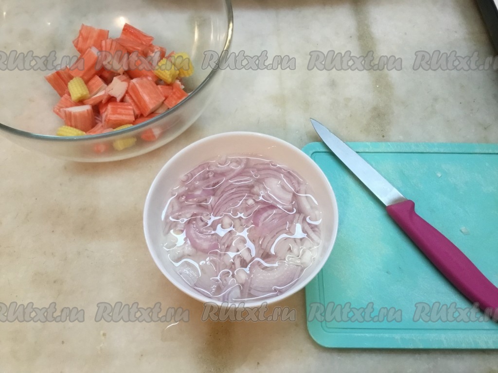 Лук нарезать полукольцами и залить кипятком. Через 5 минут слить воду и добавить лук в салатник.