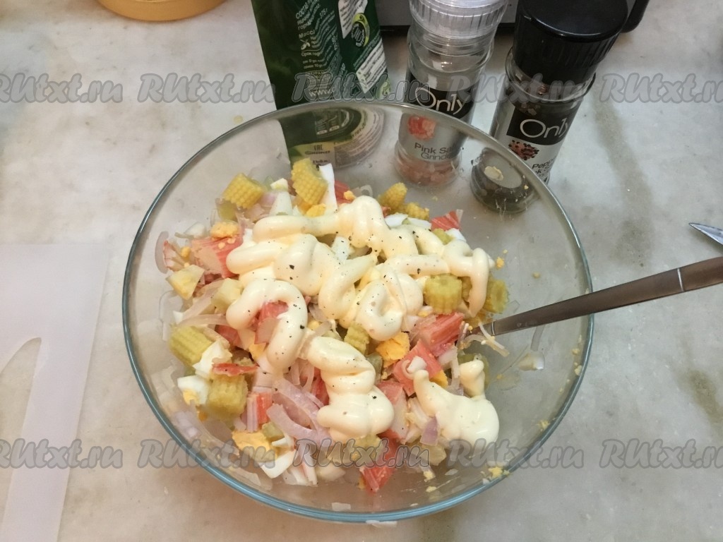 Посолить, поперчить салат, добавить майонез, перемешать.