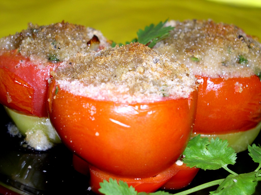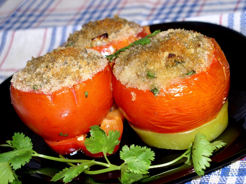 Наполняем подготовленные помидоры остывшими обжаренными овощами, посыпаем панировочными сухарями и выкладываем в форму для выпечки. Каждый фаршированный помидор сбрызгиваем растительным маслом и отправляем в духовку, разогретую до 180 градусов, и запекаем до готовности (в течение минут 20).