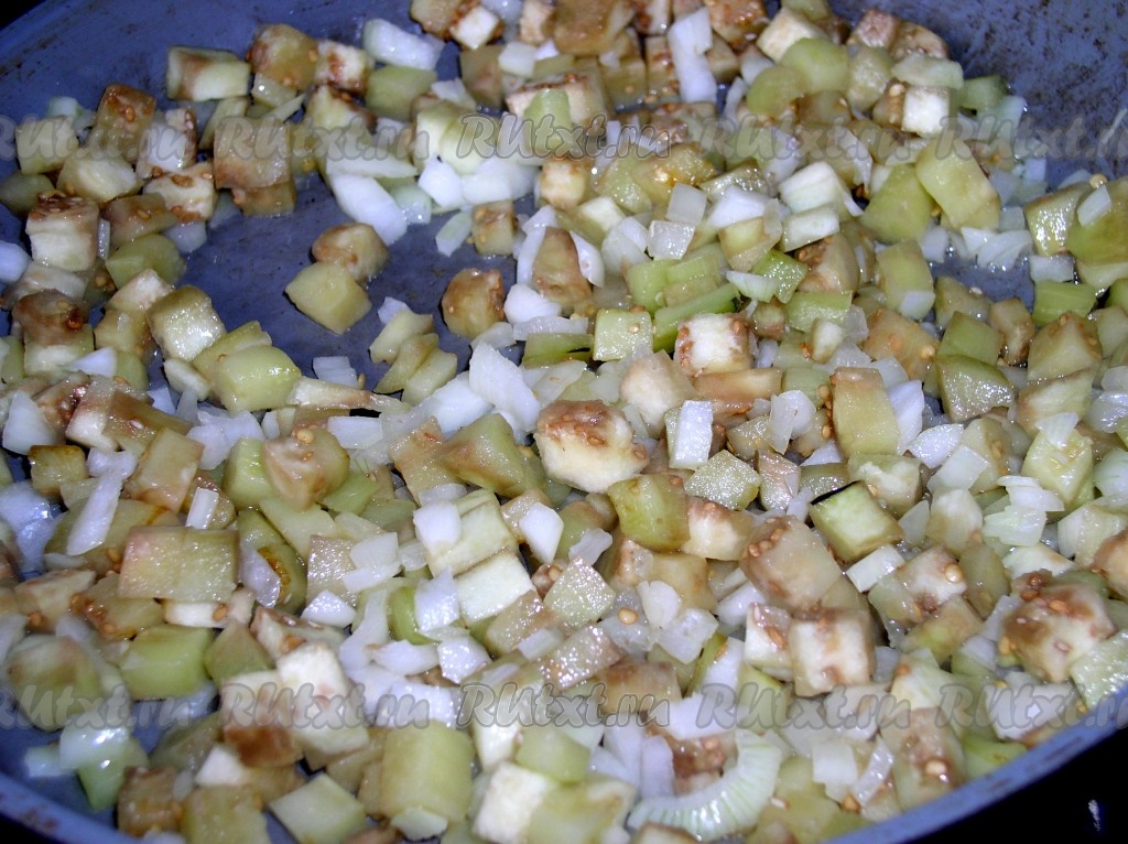 В разогретом растительном масле обжарим сначала на среднем огне баклажаны в течение нескольких минут, помешивая, а затем добавим лук, нарезанную зелень и чеснок, пропущенный через пресс. Обжариваем, помешивая, до золотистости лука, солим и перчим. Обжаренным овощам даём остыть.