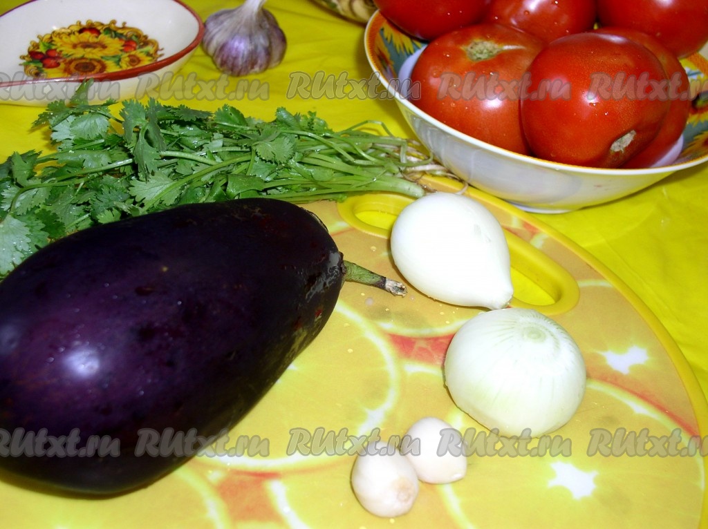 Помидоры, баклажан и лук вымоем и обсушим. Чеснок и лук очистим. Мелко нарежем репчатый лук. Баклажан очистим и нарежем мелкими кубиками.