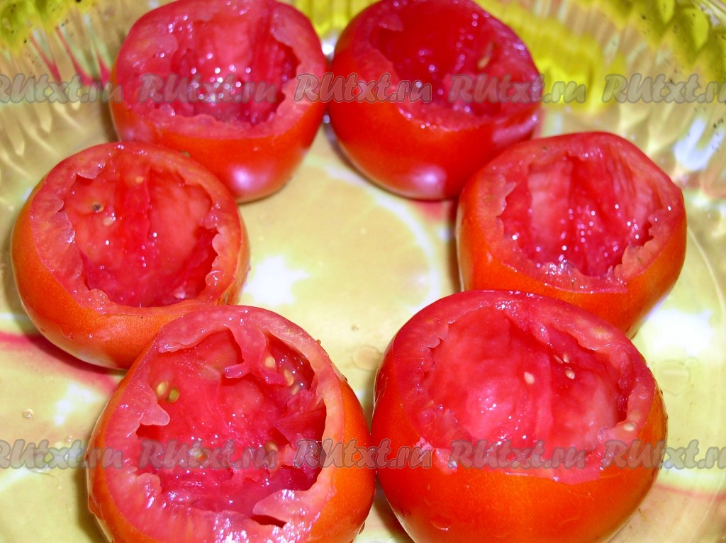 С каждого помидора срезаем верхушку и осторожно с помощью ложки удаляем семена из помидорчиков. У нас должны получиться "стаканчики" из помидоров, как на фото.