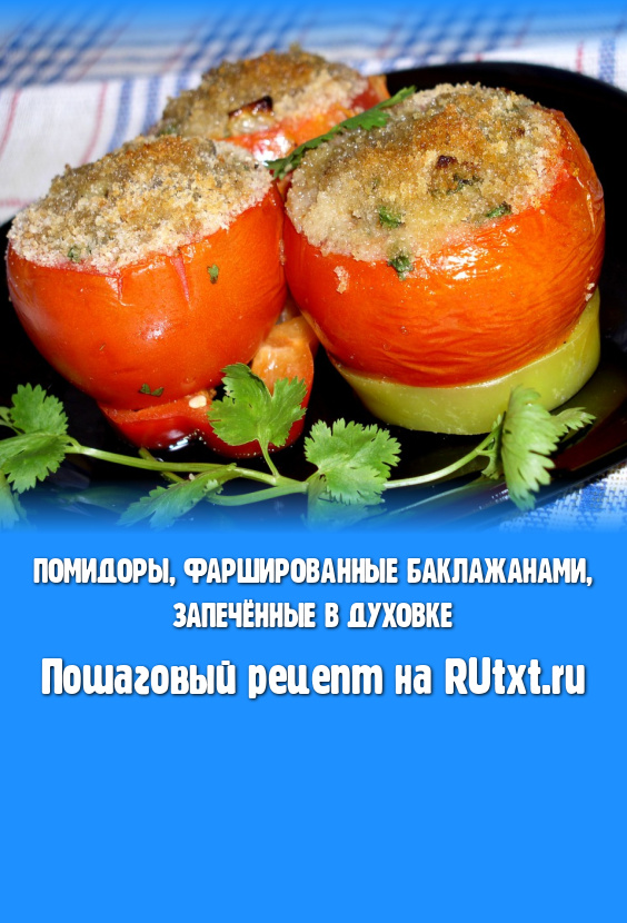 Помидоры, фаршированные баклажанами и запечённые в духовке, - очень вкусная горячая закуска. Готовится блюдо достаточно быстро и просто. Изюминкой рецепта является то, что перед запеканием фаршированные помидоры посыпаются панировочными сухарями. Многие диетологи считают, что использование сухарей при запекании делает блюдо более полезным. Ещё наши прабабушки знали об этом свойстве сухарей и использовали их в выпечке, подливах и во многих других блюдах.