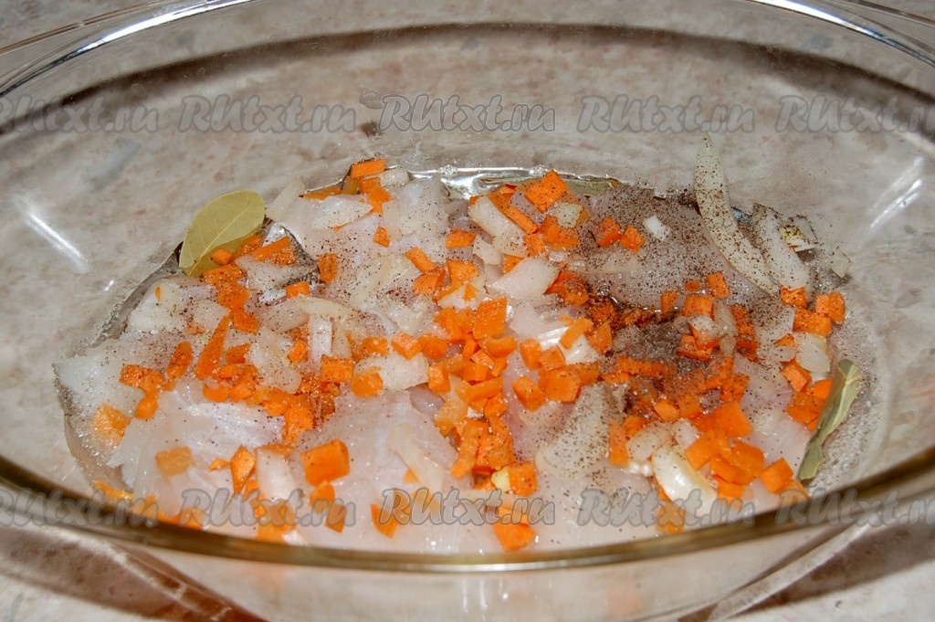Возьмем форму (достаточно глубокую) и уложим рядами рыбу и овощи. Ряд рыбы, затем ряд овощей и так до полного заполнения формы. Каждый ряд пересыпаем солью, сахаром, перцем.