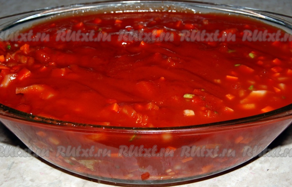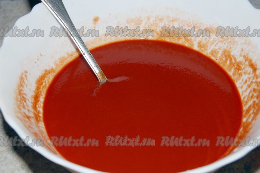 Томатную пасту разведем водой до состояния жидкого соуса.