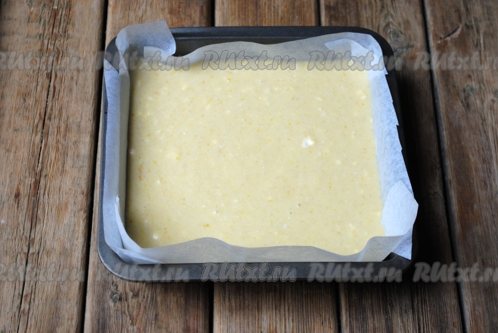 Застелить пергаментом форму для выпечки (размер моей формы 20х20 сантиметров) и вылить тесто.