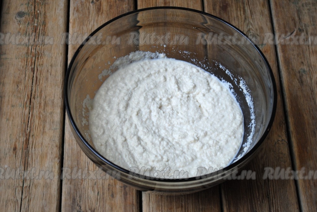 Всыпать разрыхлитель, хорошо перемешать, должно получиться однородное тесто, по консистенции напоминающее густую сметану.