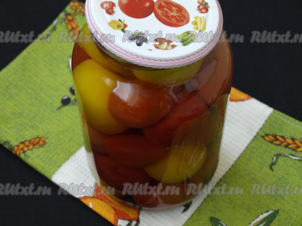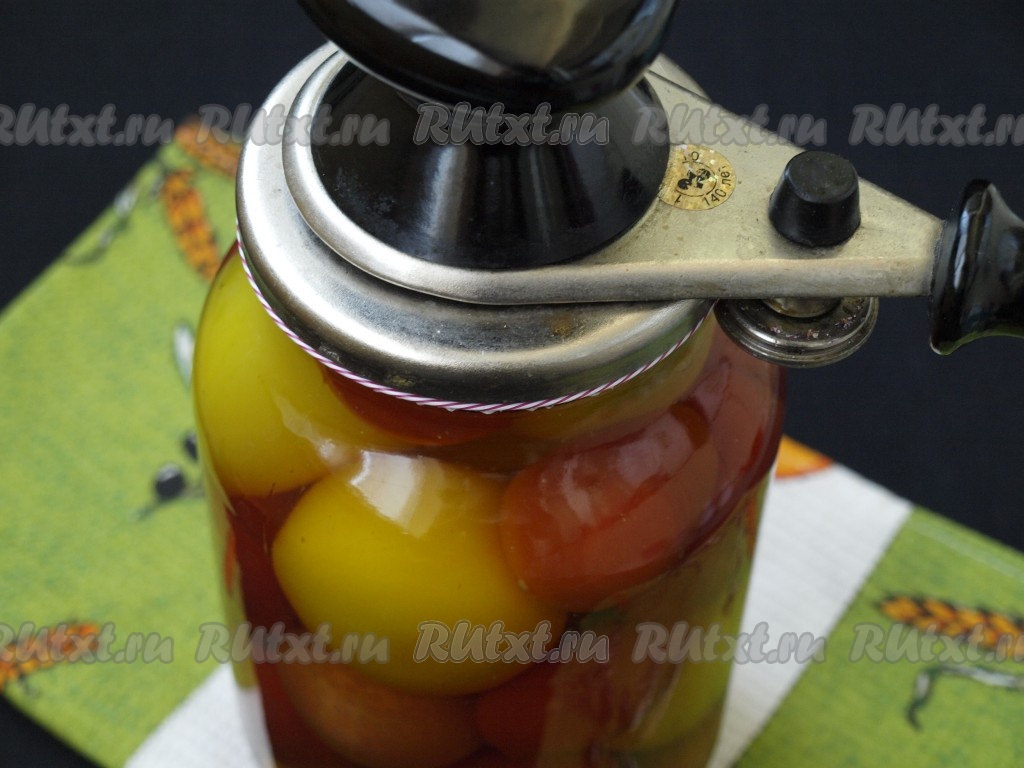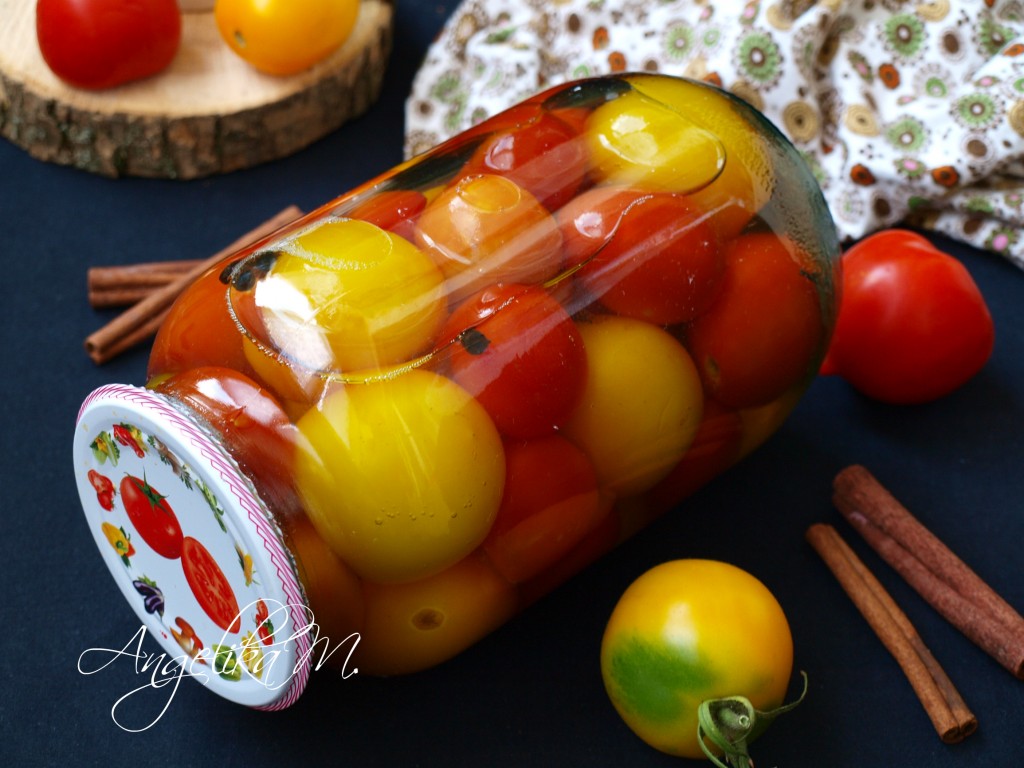 Палочку корицы удалить, больше она нам не понадобится. Кипящим маринадом залить помидоры в банке и сразу закатать ключом.