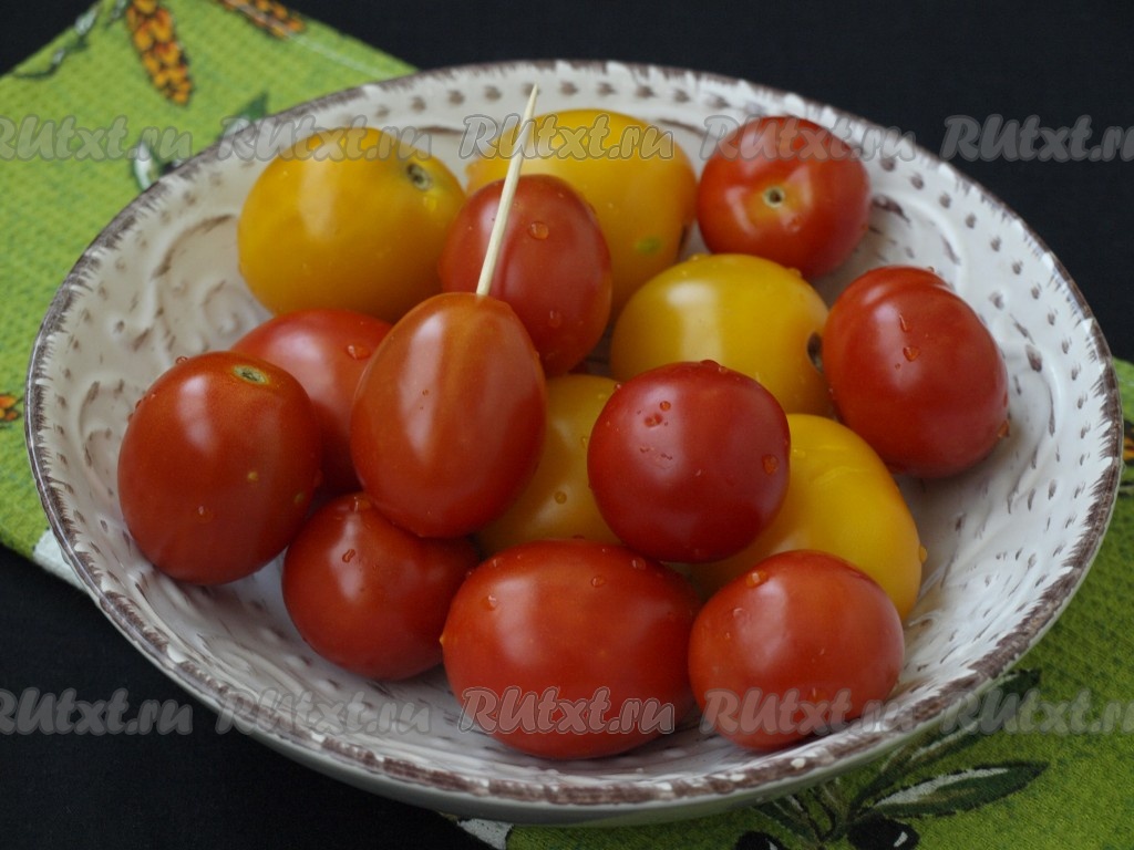 Помидоры вымыть и с помощью зубочистки сделать прокол в месте плодоножки, это необходимо для того, чтобы плоды не потрескались (выбирайте плотные помидоры, лучше сорта "сливки").