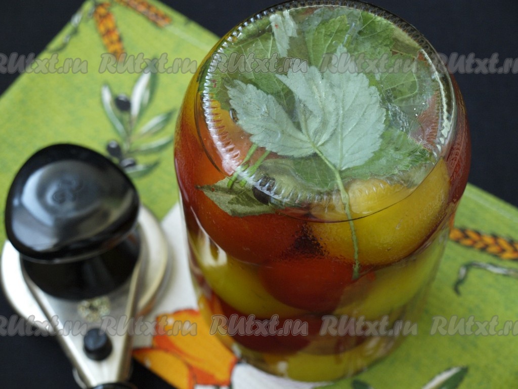 На дно чистой простерилизованной банки выложить листья смородины и малины, лавровые листья и душистый перец. Наполнить банку помидорами.