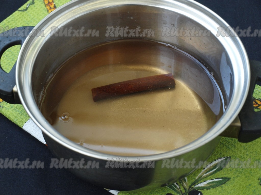 Спустя время воду из банки слить в кастрюлю, снова положить в неё палочку корицы, добавить сахар, соль и уксус. Довести маринад до кипения и варить 3 минуты.