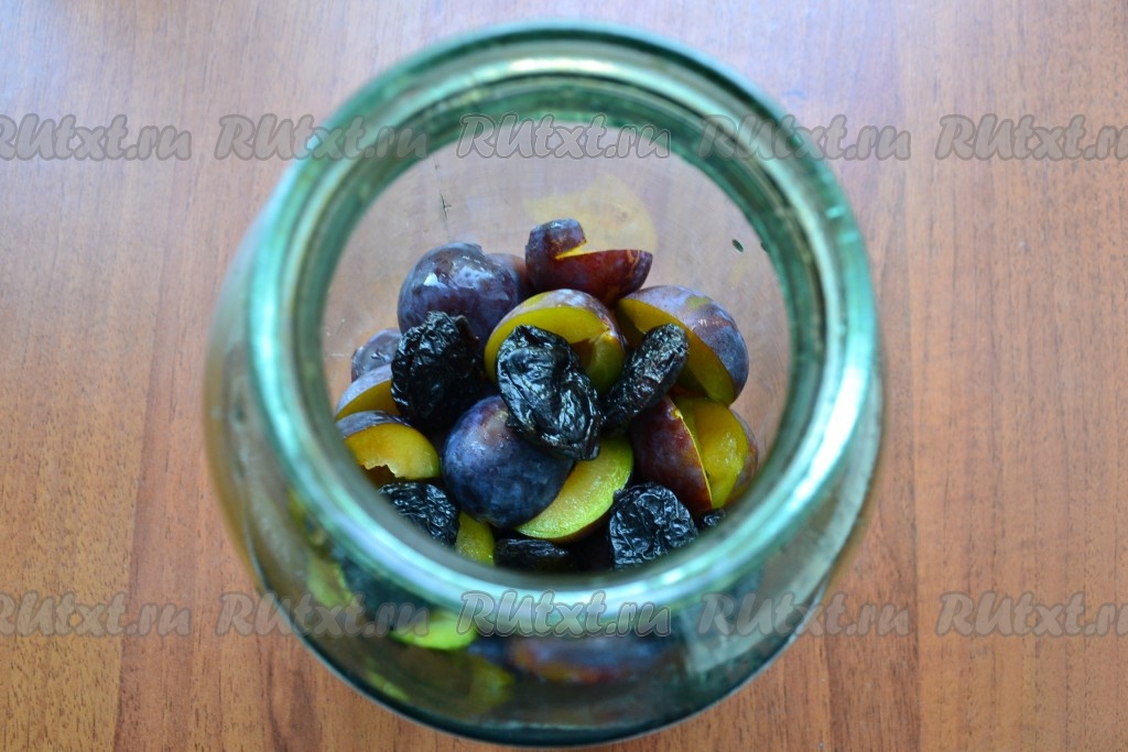 Банку хорошо промыть и обдать кипятком, крышку прокипятить. В банку выложить половинки слив, добавить промытый чернослив.