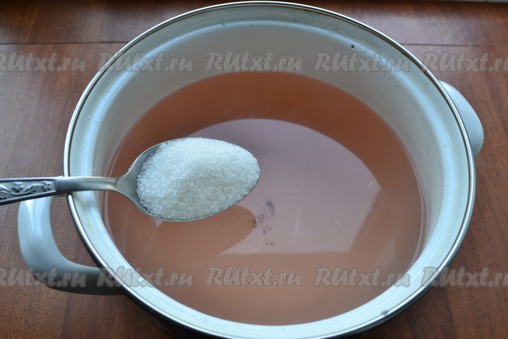 Далее воду из банки слить в кастрюлю, всыпать сахар и довести сироп до кипения.