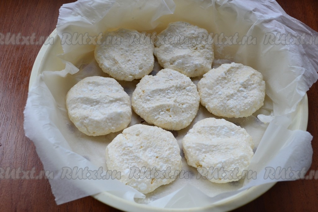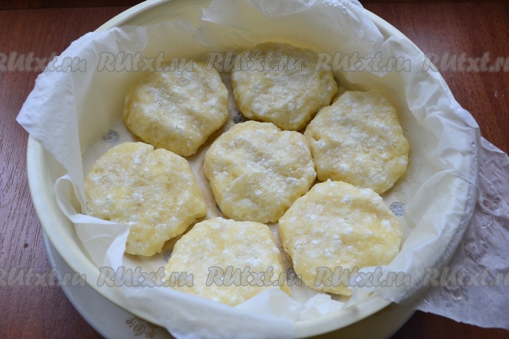 Мокрыми руками сформировать небольшие лепешки, выложить их в чашу для варки на пару (можно предварительно застелить чашу бумагой для выпечки).