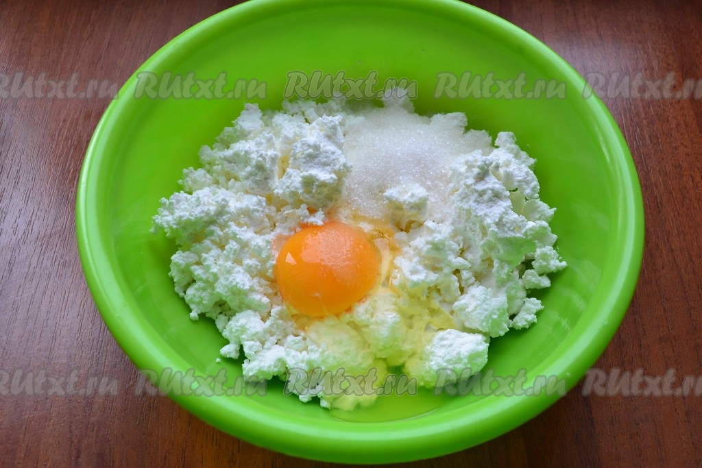В творог добавить соль, сахар, ванильный сахар и сырое яйцо.