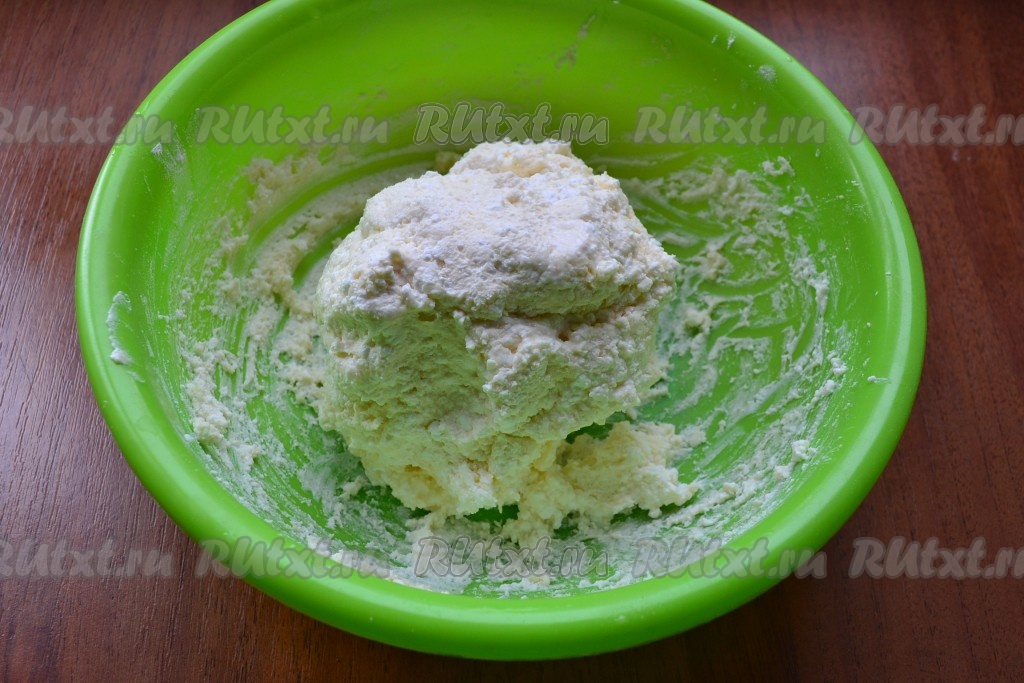 Все хорошо растереть, всыпать муку и замесить тесто, которое будет немного липнущим.