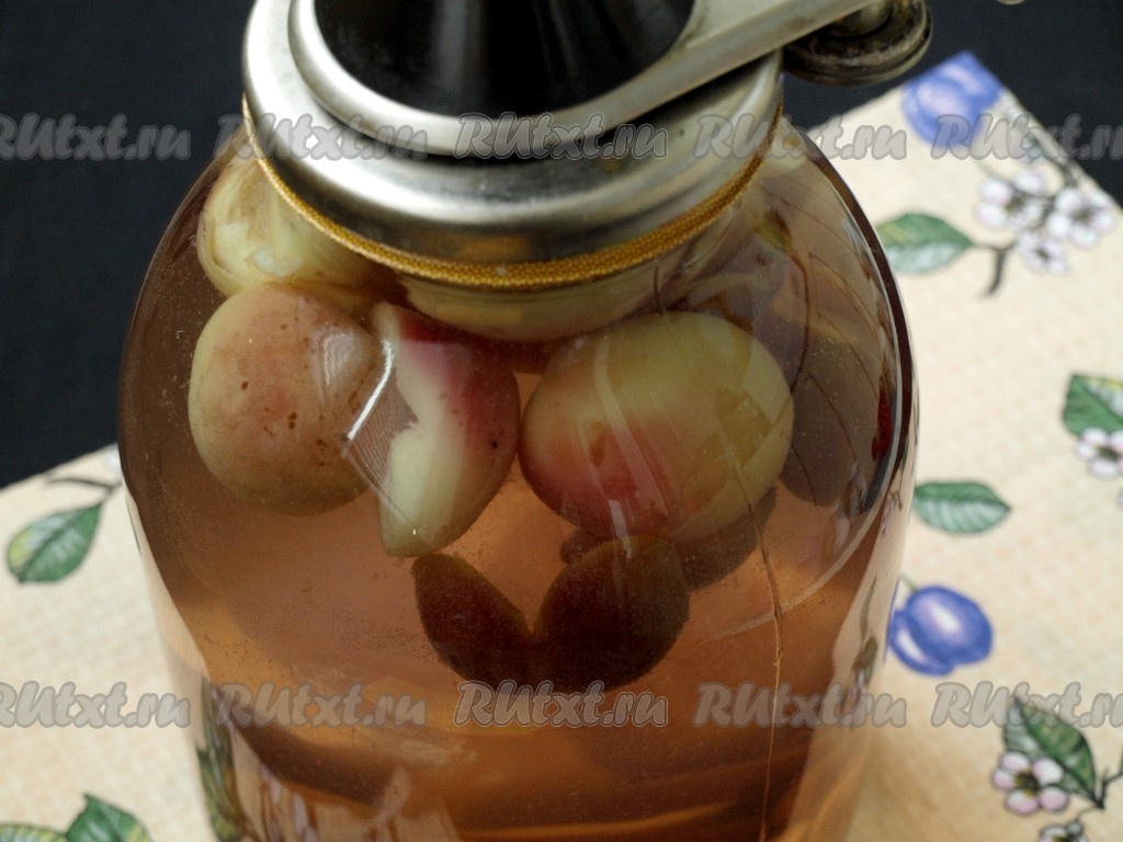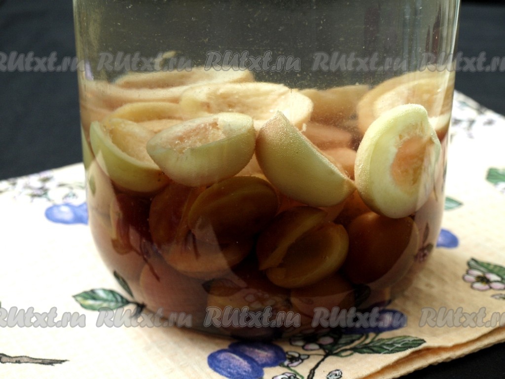 Вот и наступил сезон персиков, а пока ещё есть сливы, решила заготовить совместный компот на зиму. Персики у нас мелкие и не очень сладкие, поэтому сахара можно добавлять больше. Когда компот из персиков и слив хорошо настоится, он станет очень ароматным и более сладким, чем может показаться сразу. Расчёт фруктов дан на 3-х литровую банку. Вес фруктов указан без косточек.