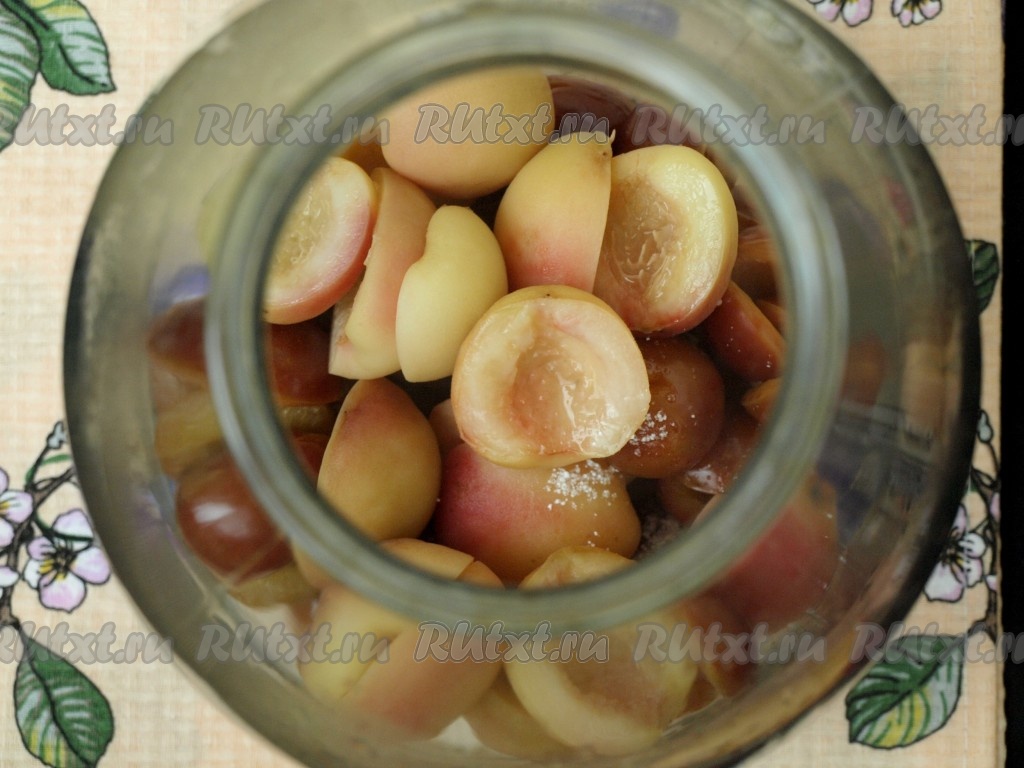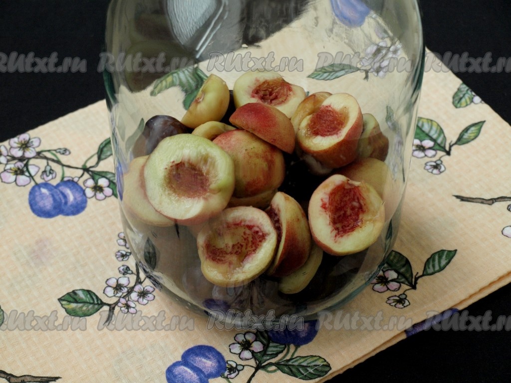 Банку хорошо вымыть горячей водой, можно не стерилизовать. Опустить в неё сливы и персики.