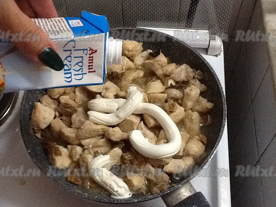 Нарезать размоченные белые грибы и добавить в сковороду. Если вы используете смесь лесных грибов, то рекомендую их отварить в воде для замачивания, слегка подсолив, в течение 10 минут. Только потом добавить в сковороду к куриной грудке.