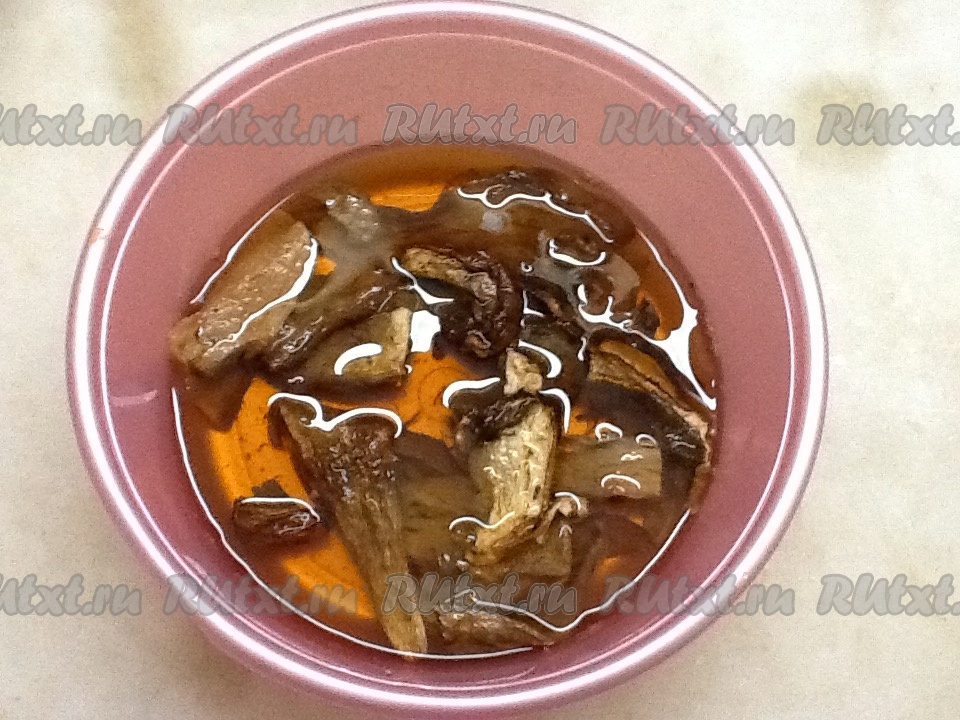 Сухие лесные грибы (у меня - белые) вымыть и замочить в кипяченой воде на 30 минут.