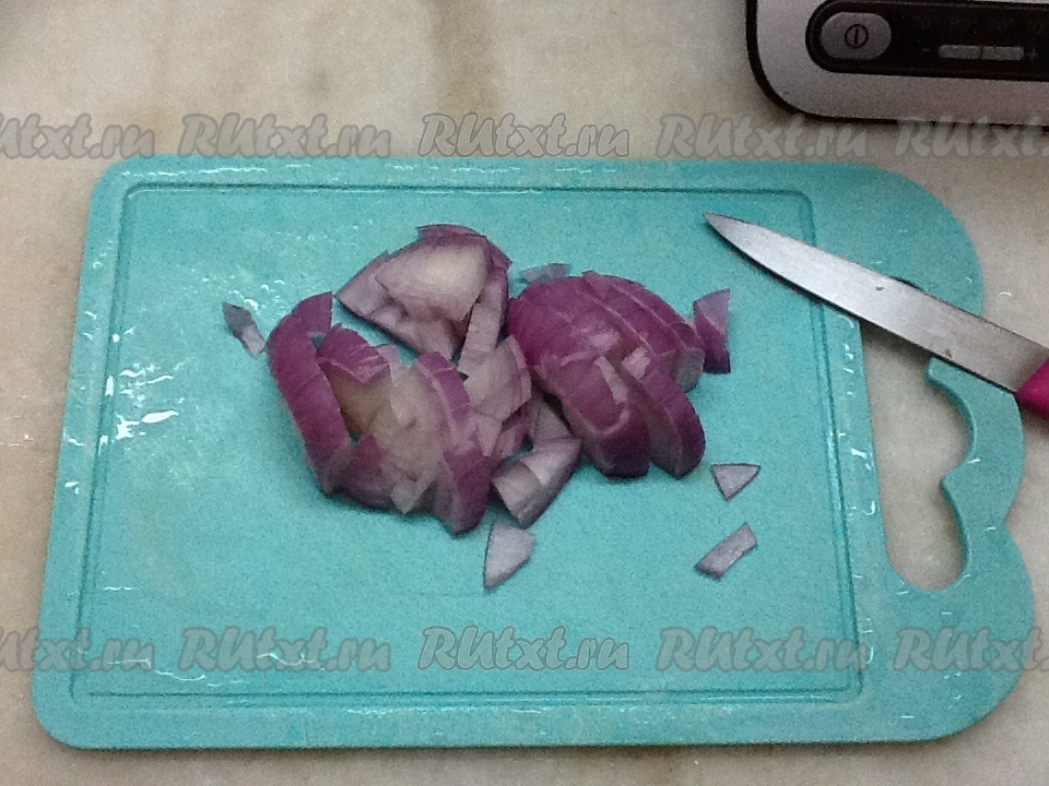 Нарезать лук и добавить его на сковороду к куриной грудке. Обжаривать на среднем огне, пока лук не станет прозрачным. Посолить и поперчить по вкусу.