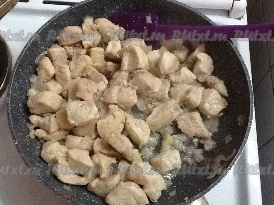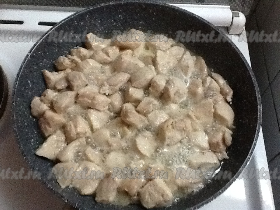Куриную грудку нарезать на кусочки и выложить на разогретую сковороду с небольшим количеством подсолнечного масла. Обжарить, помешивая, в течение нескольких минут.