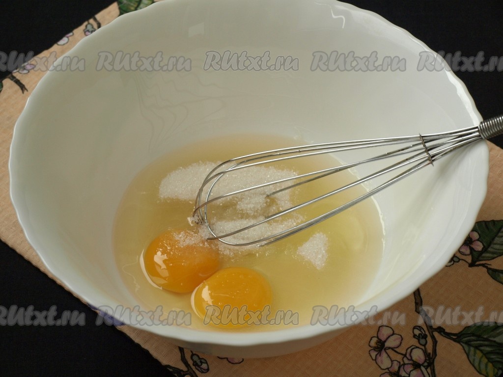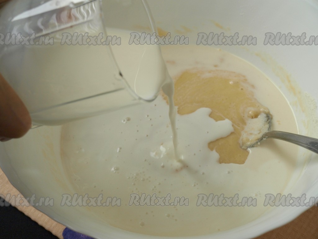 В несколько приёмов добавить молоко, размешивая каждый раз до однородной массы. Молоко должно быть комнатной температуры или слегка тёплое. Тесто будет жидкое, как на блины.