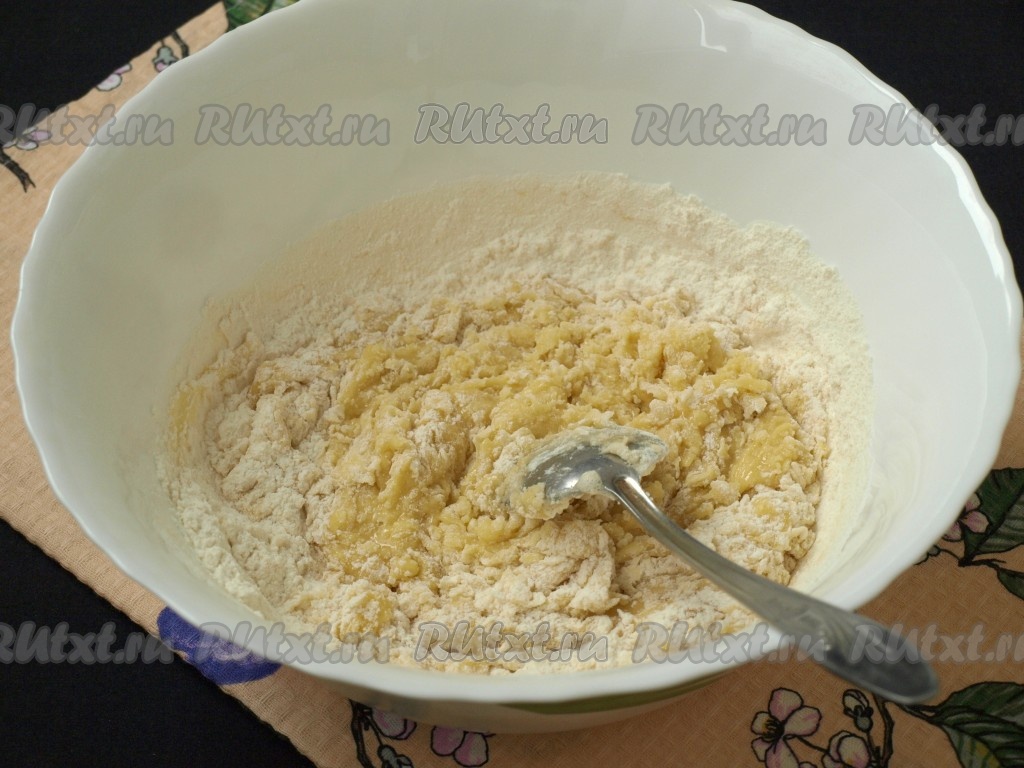 Просеять в получившуюся смесь муку и ванилин, тесто перемешать ложкой.