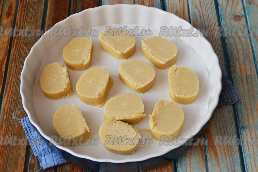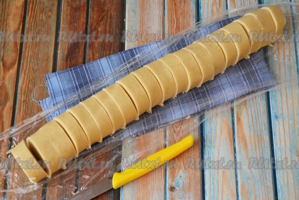 По истечении времени разрезать валик из теста на кусочки толщиной 1 см.