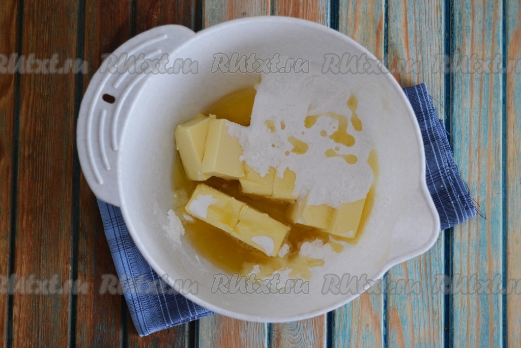 В глубокой миске соединить подтаявшее сливочное масло, сахарную пудру и подсолнечное масло. Масло лучше использовать рафинированное без запаха, чтобы его вкус и аромат не повлияли на вкус и аромат готового печенья.