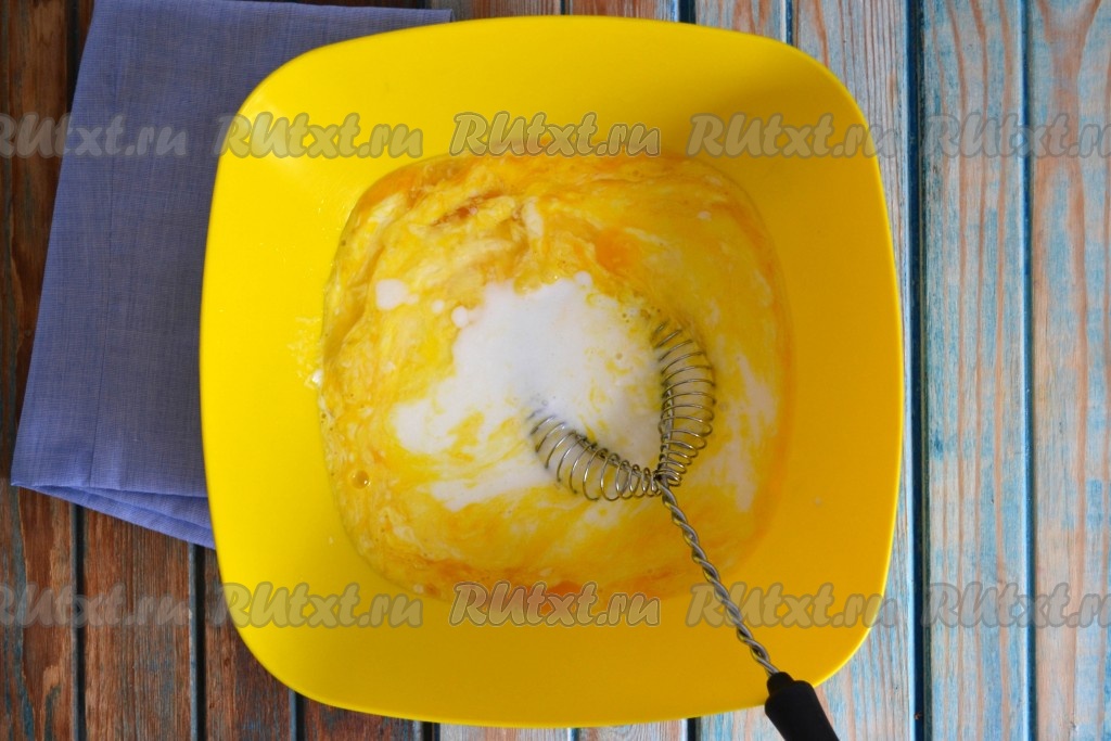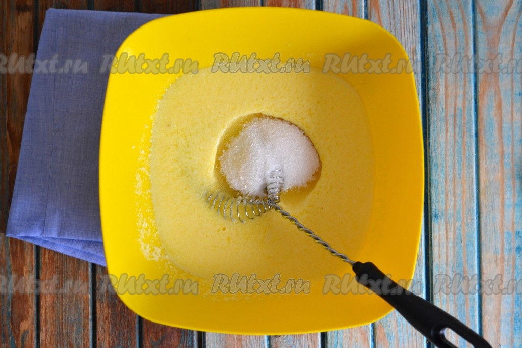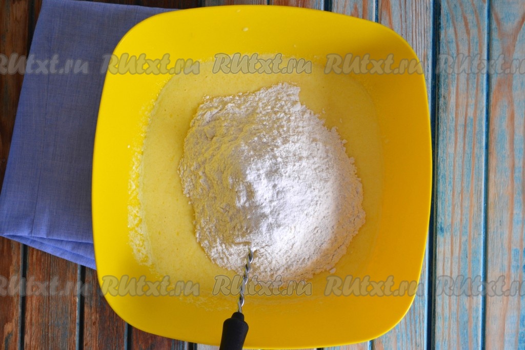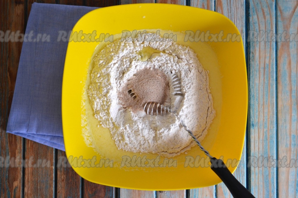 Также всыпать разрыхлитель и сахар с корицей (или просто добавить щепотку молотой корицы).