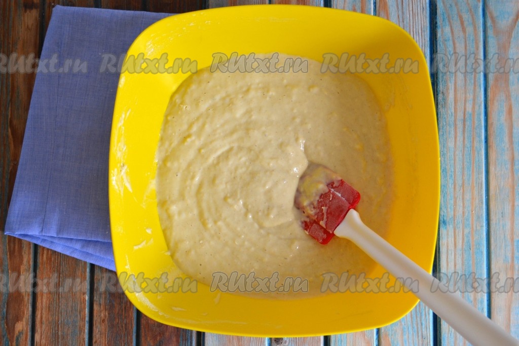 Тщательно перемешивая массу, довести её до однородности. В ней не должно быть комочков муки. По консистенции тесто будет напоминать густую сметану - если поднять небольшую часть на лопатке, она будет сползать медленно и широкими лентами.