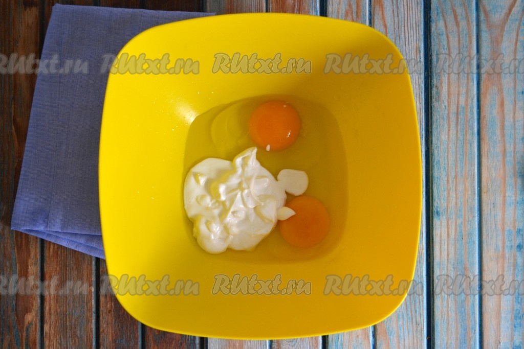 В глубокую миску вбить куриные яйца и добавить сметану.