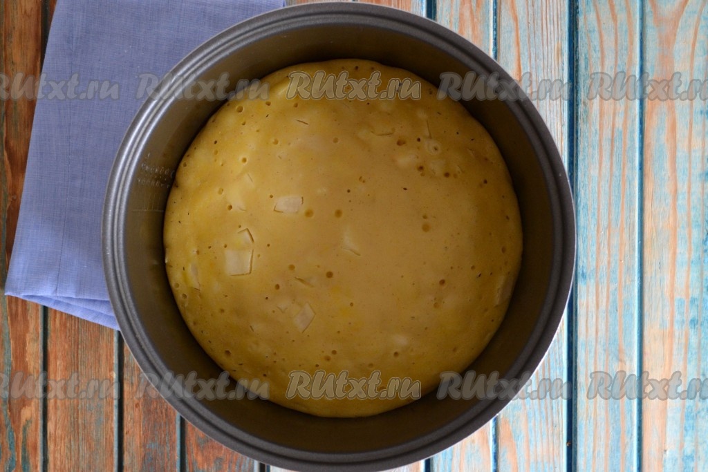 Грушу соединить с тестом, перемешать и влить в чашу мультиварки. Чашу мультиварки необходимо предварительно смазать растительным маслом.
