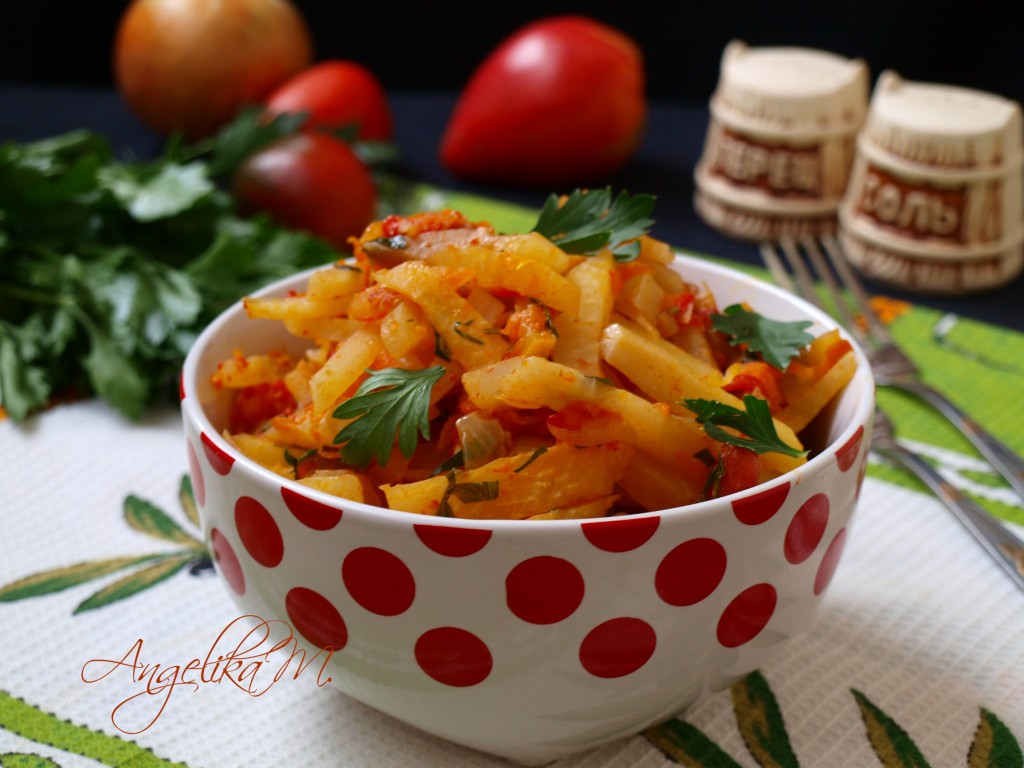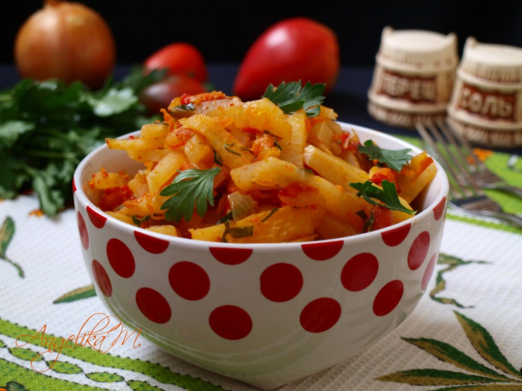 Капуста кольраби не так популярна у нас, как, скажем, белокочанная или цветная, но эта капуста считается самой низкокалорийной и обязательно будет оценена теми, кто борется с лишними килограммами. Кольраби содержит всего 44 килокалория на 100 грамм продукта. У нас совсем недавно эта капуста стала появляться на полках супермаркетов, раньше её можно было купить только у бабушек на базаре. Тушёная кольраби может подаваться как самостоятельный гарнир или в качестве дополнения к мясным блюдам.
