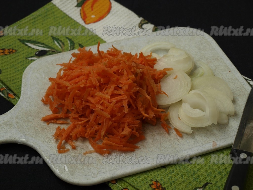 Полукольцами нарезать очищенный лук, очищенную морковь натереть на тёрке.
