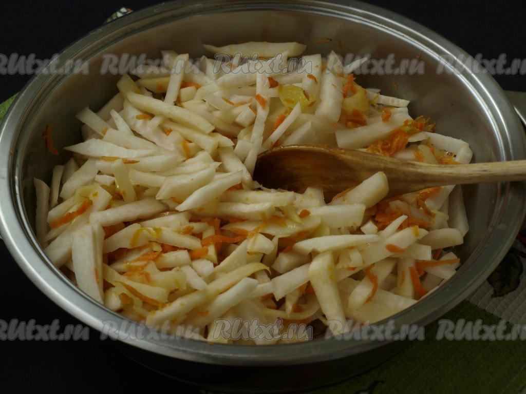 Затем добавить в сковороду кольраби и перемешать. Накрыть сковороду крышкой, убавить огонь и тушить кольраби с овощами 10-12 минут (чтобы овощи не пригорели, в сковороду влить немного воды), иногда перемешивая.