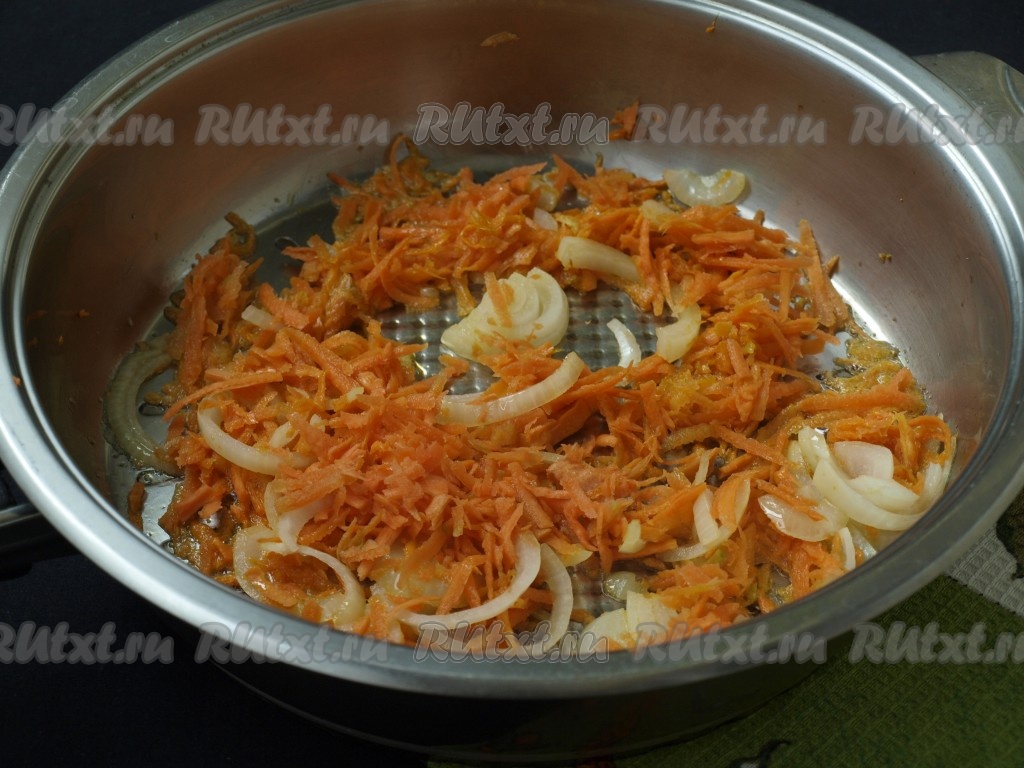 Разогреть в сковороде подсолнечное масло, выложить в него лук и морковь, обжарить, помешивая, до прозрачности лука.