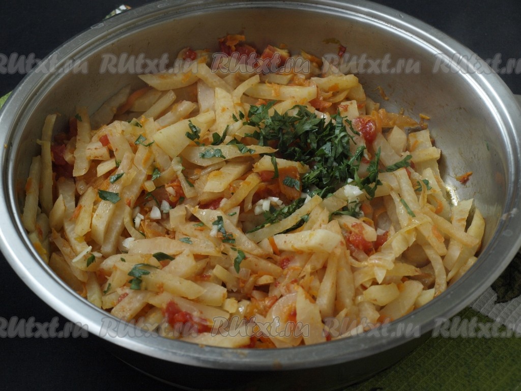 За минуту до окончания приготовления добавить в сковороду измельчённые чеснок и петрушку. Дать кольраби настояться под закрытой крышкой 7-10 минут.